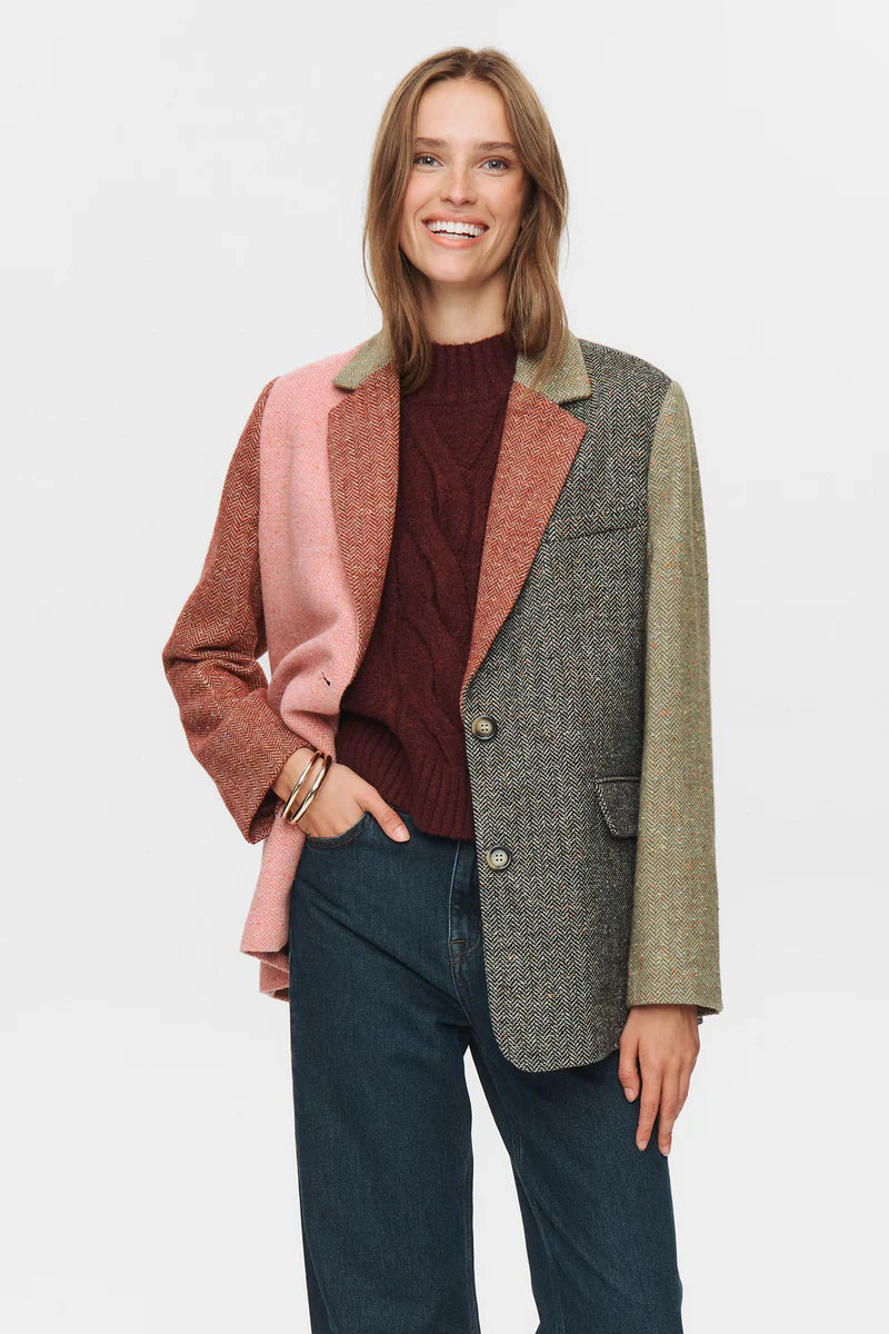 An oversized tweed patch blazer crafted from textured wool, featuring patch pockets, structured shoulders, and warm tortoise buttons that add a classic yet effortlessly modern touch.