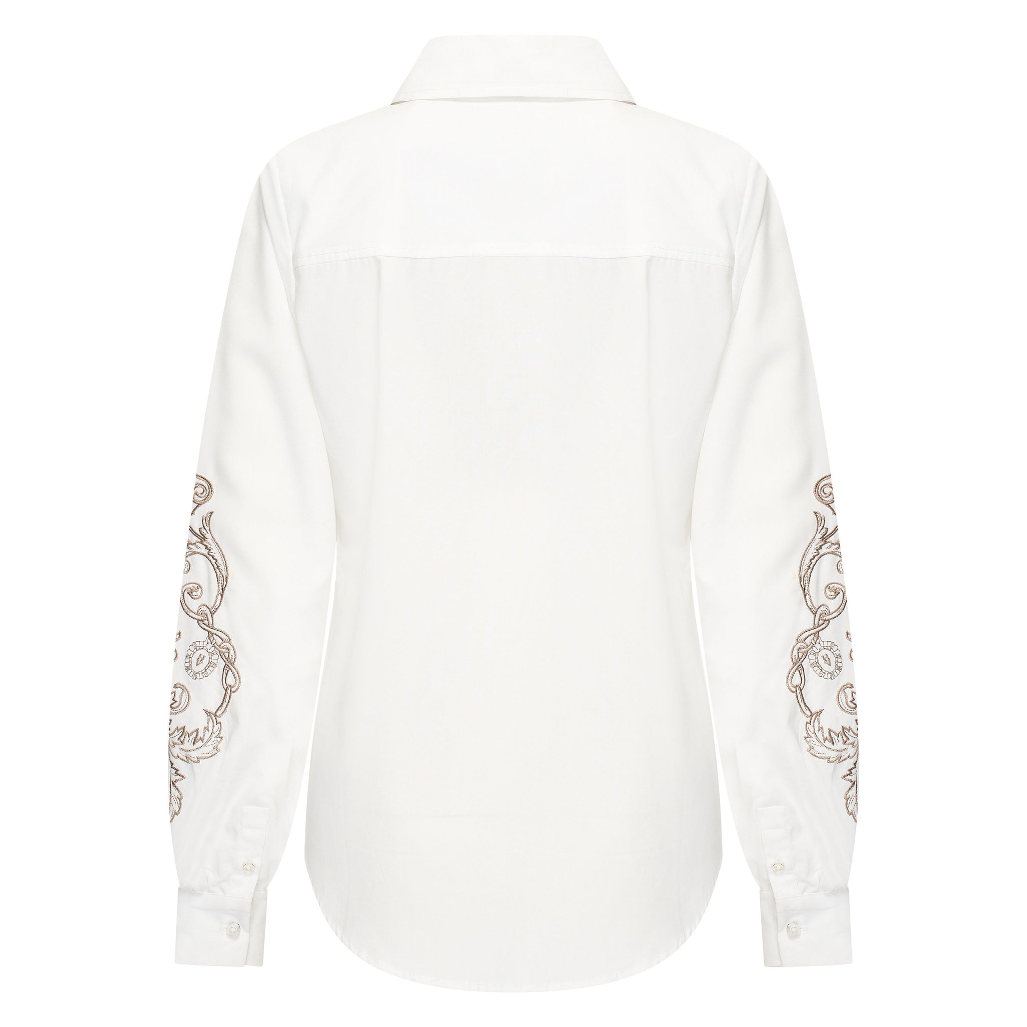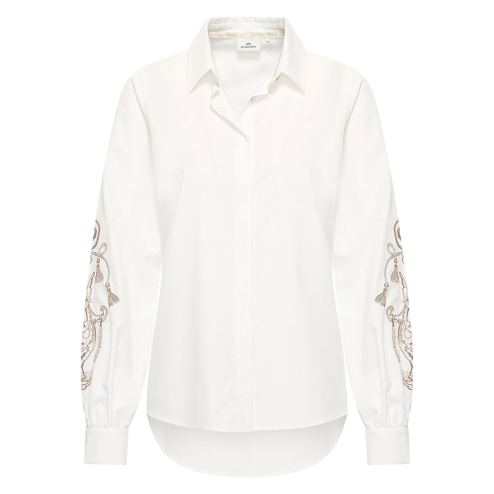 This white blouse features delicate champagne embroidery for an elegant, refined look. Versatile and timeless, it pairs effortlessly with both casual and formal outfits .