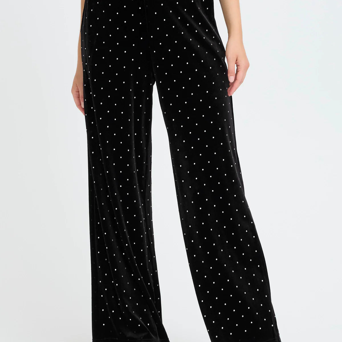 Step into sparkle with these long velvet trousers, covered head-to-toe in shimmering stones. Luxe vibes guaranteed—perfect for when you want to shine day or night.