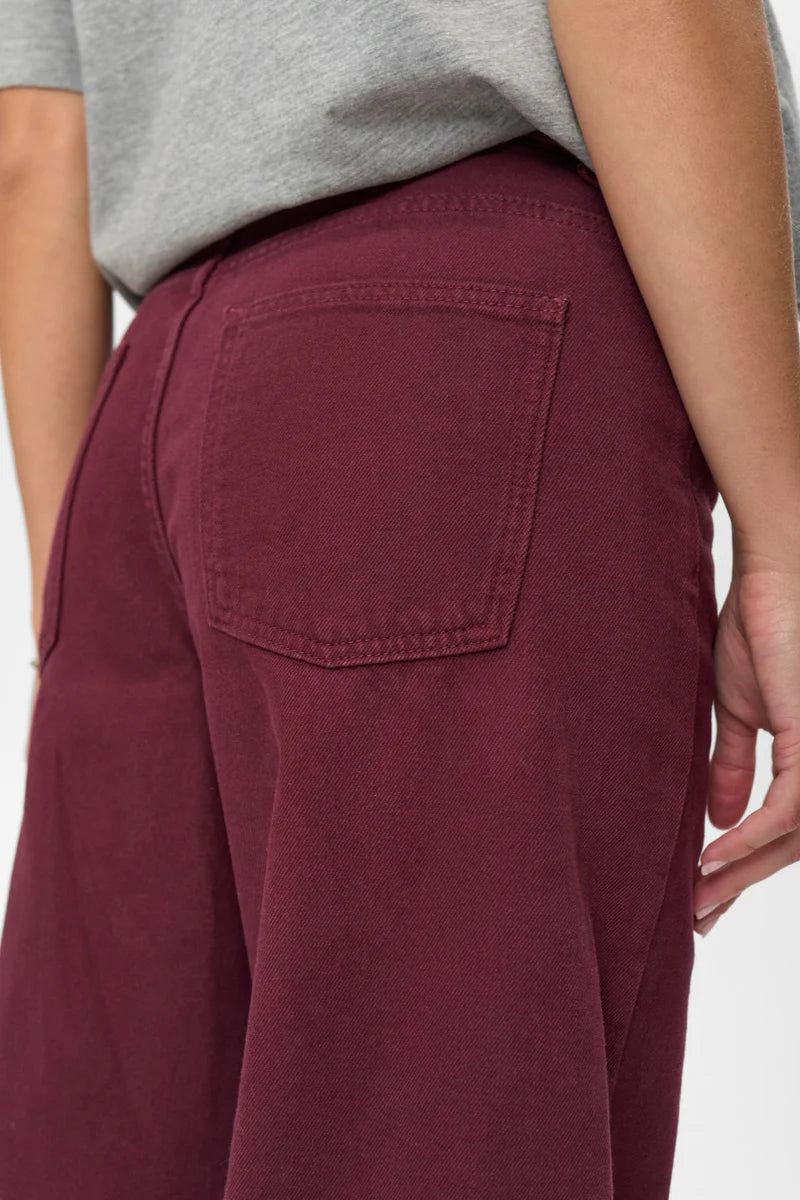 Maroon high-waisted wide leg jeans with a waist tie are bold and flattering . The rich colour and cinched waist bring effortless drama to a classic silhouette .