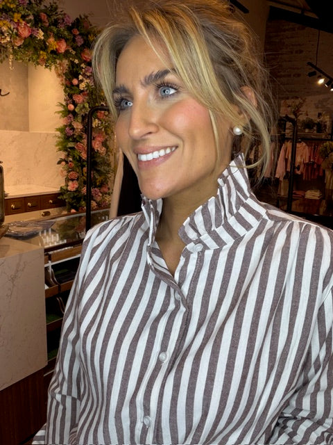 Brown + White Striped Ruffle Blouse