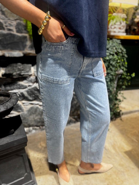 Wide leg jeans with a high-rise waist, straight cut silhouette, and relaxed fit throughout. Classic five-pocket design and visible seam detailing for a laid-back finish.