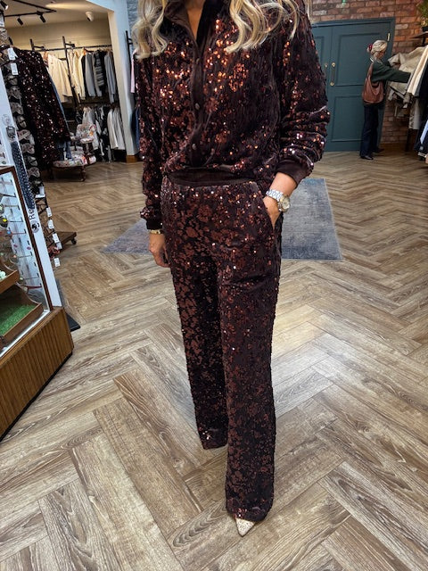 Elevate your evening look with these luxurious velvet trousers in a rich coffee-bean brown shade. Featuring shimmering sequin detailing that catches the light beautifully, these trousers combine comfort and glamour. The elasticated waistband ensures a perfect fit while maintaining ease of movement.