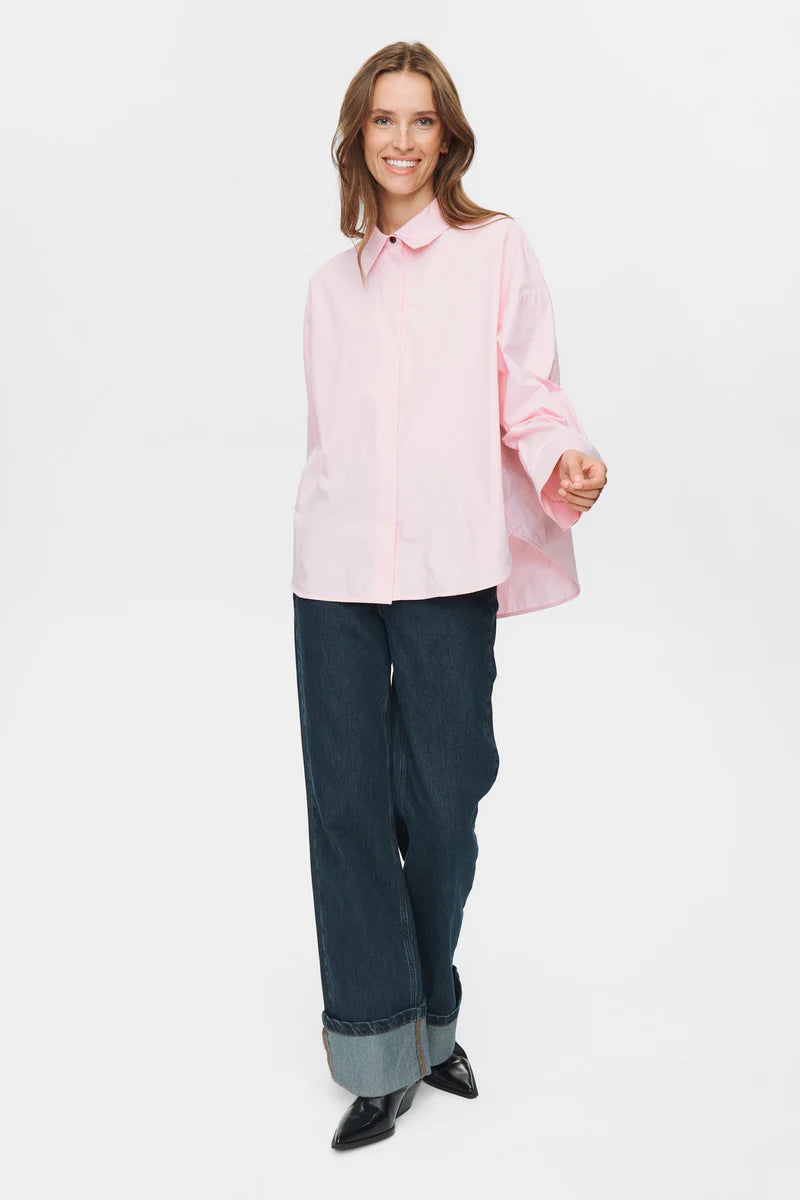 A pink shirt with buttoned up back and an elongated hem is chic with a modern twist. The unexpected detailing gives a fresh edge to a classic style.
