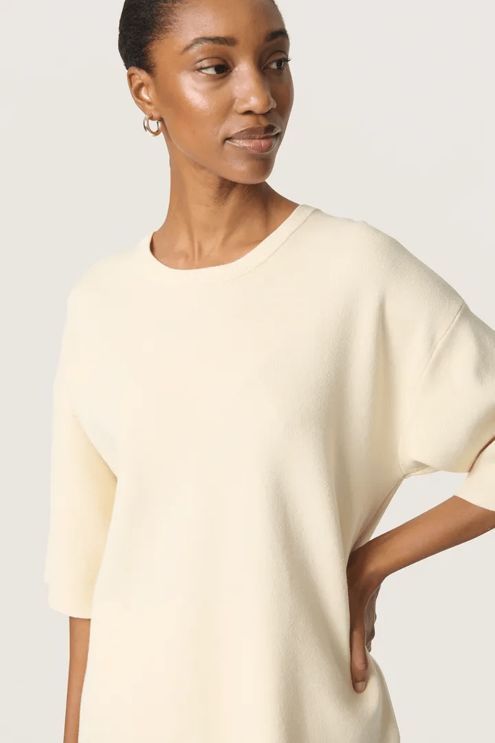 Soaked in luxury knit in whisper white, featuring a dropped shoulder and 3/4 length sleeve.