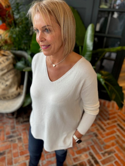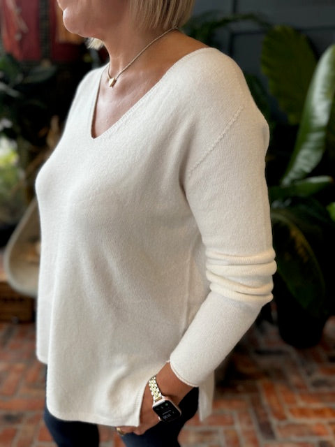 A timeless cream V-neck knit crafted from super soft viscose. Lightweight, soft, and versatile—perfect for effortless layering and everyday elegance