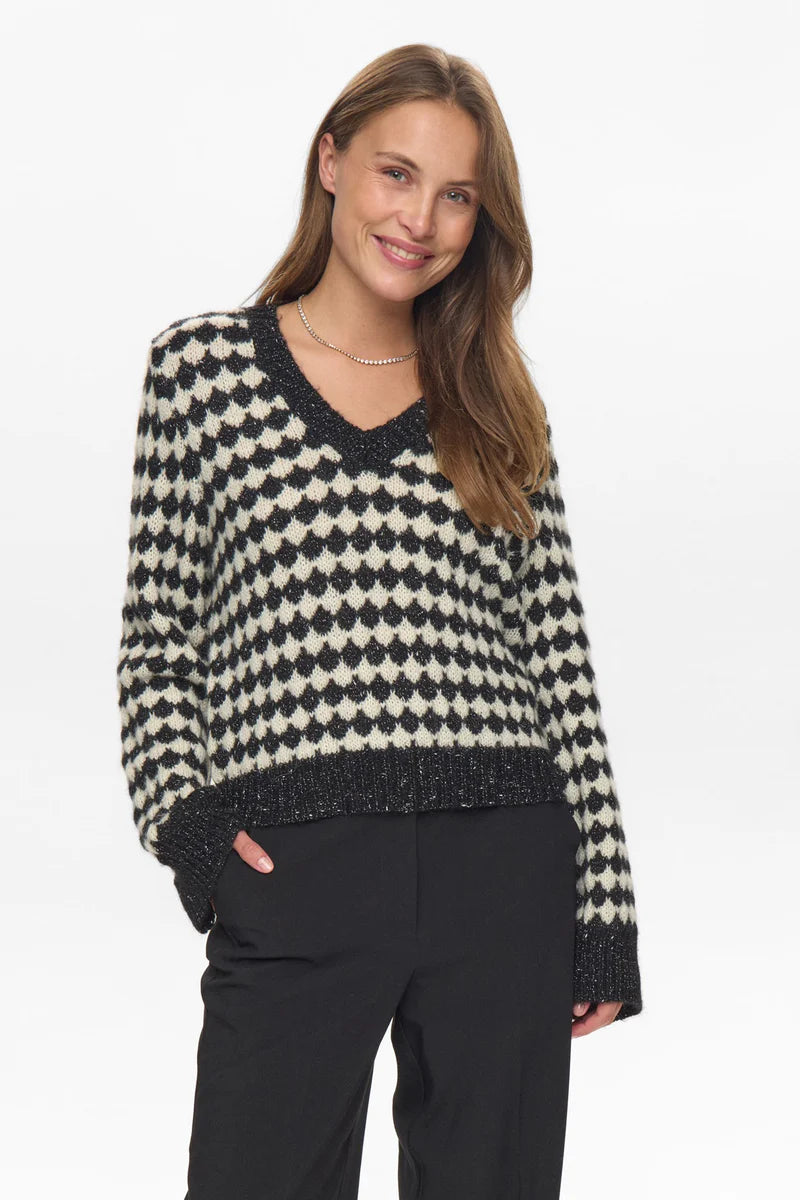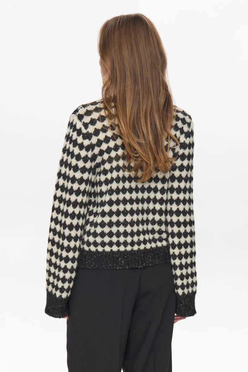 A black and white checkered V-neck knit woven with silver thread throughout, combining classic contrast with a subtle metallic shimmer for a refined, modern finish.