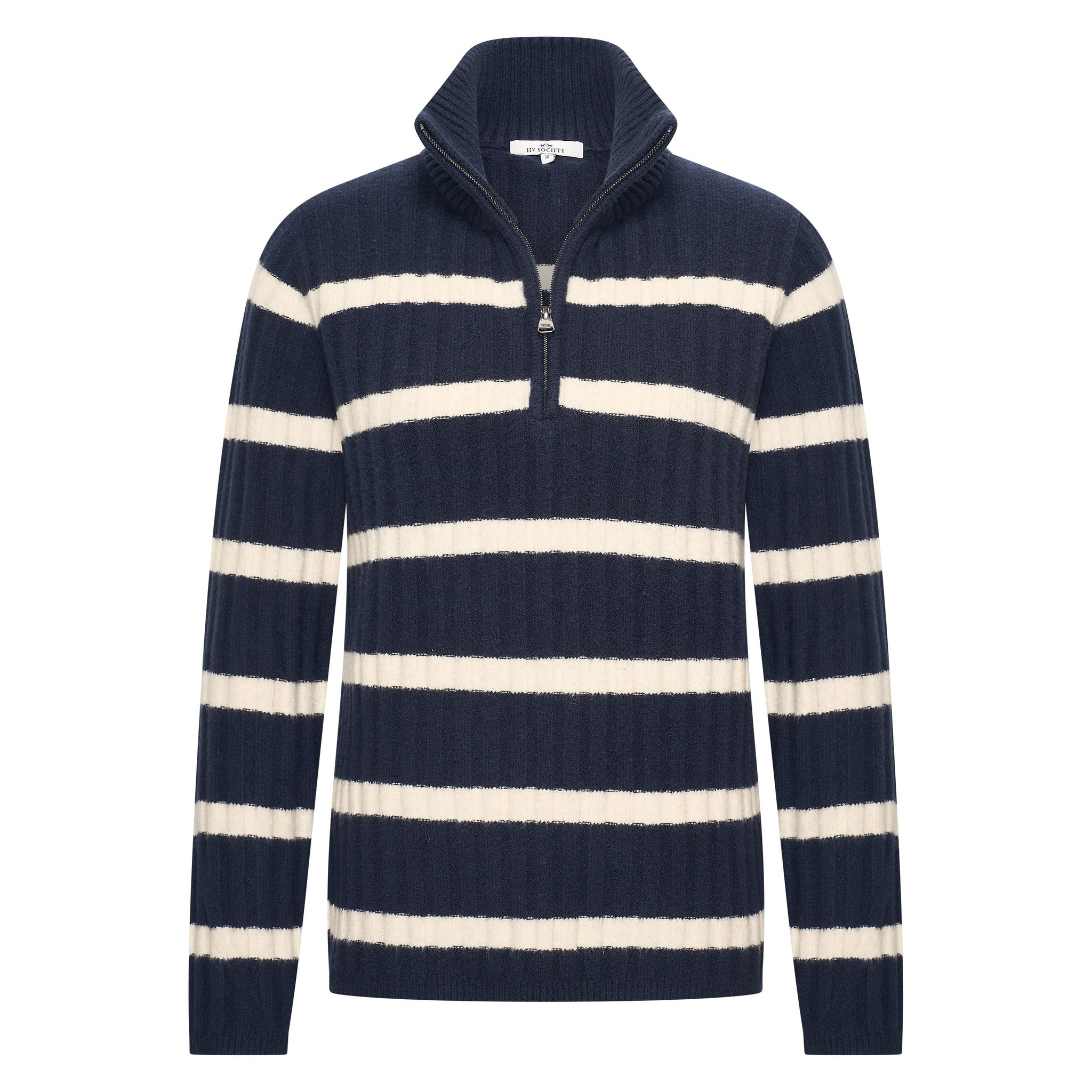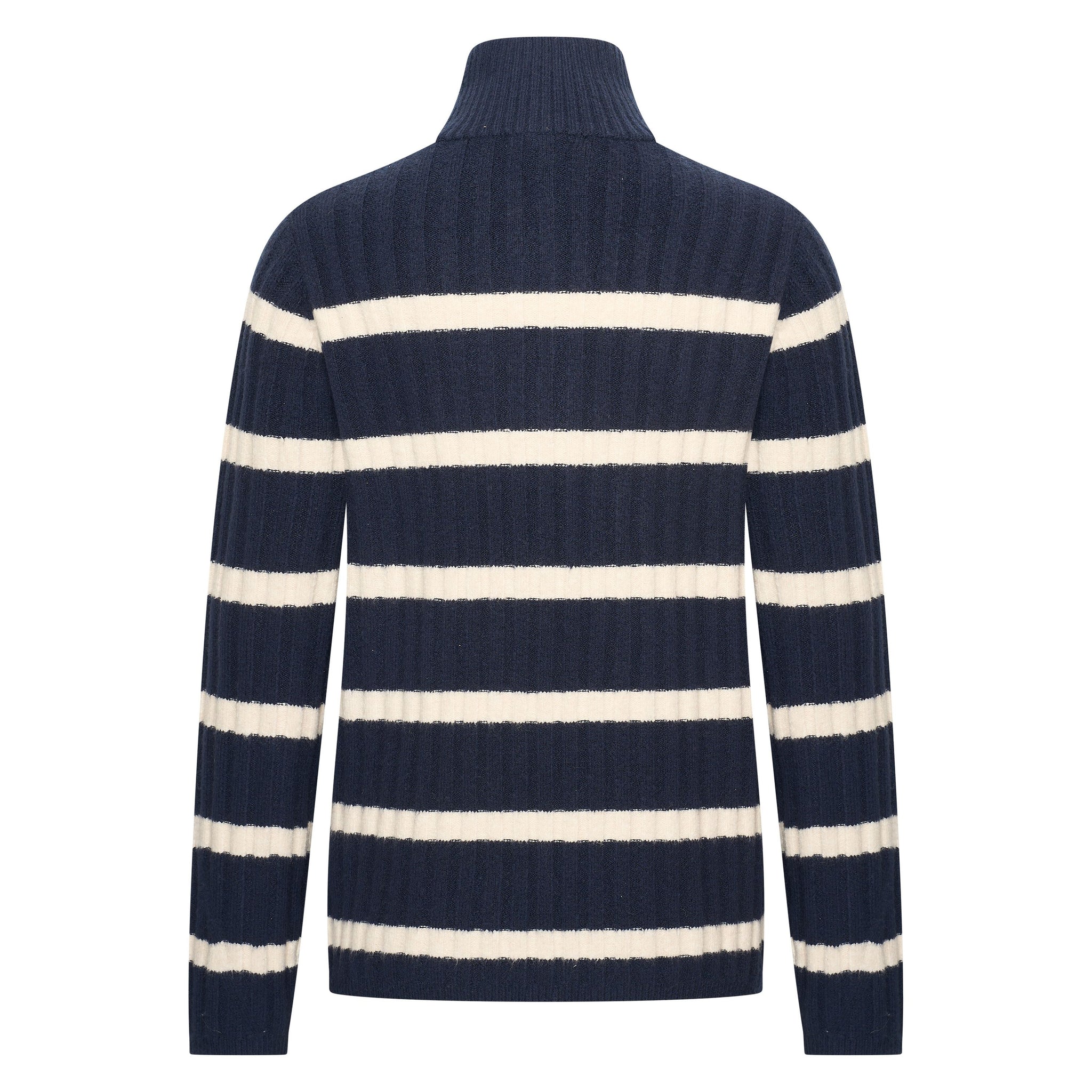 This cream and navy striped quarter- zipper combines sporty style with casual comfort. It's lightweight design and classic stripes make it perfect for layering everyday wear.