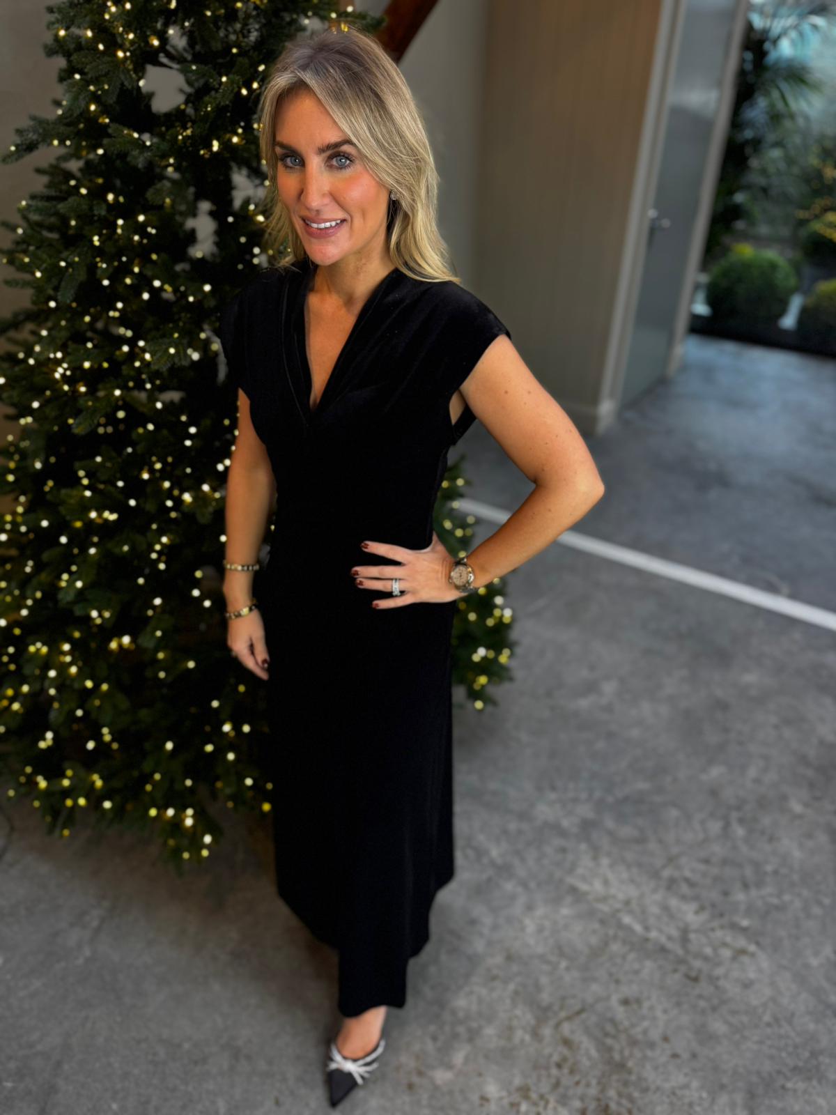 Maxi velvet dress features a flowing A-line silhouette, deep V-neckline, and cap sleeves for refined comfort. Ideal for smart-casual to formal settings, this elegant long dress offers timeless style with a relaxed fit.